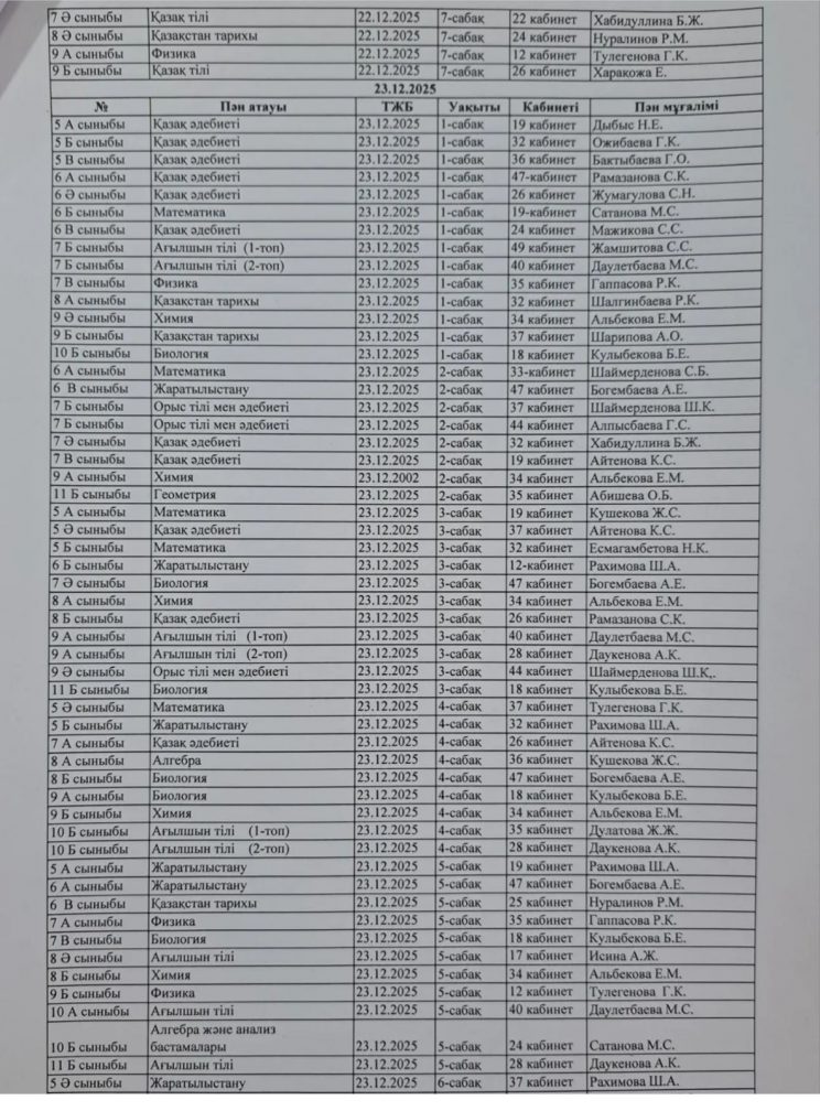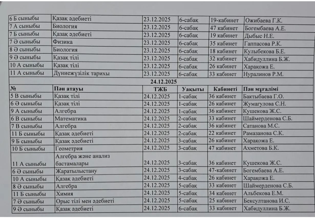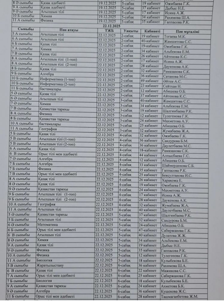 2025-2026 оқу жылының 2- тоқсандағы ТЖБ кестесі
