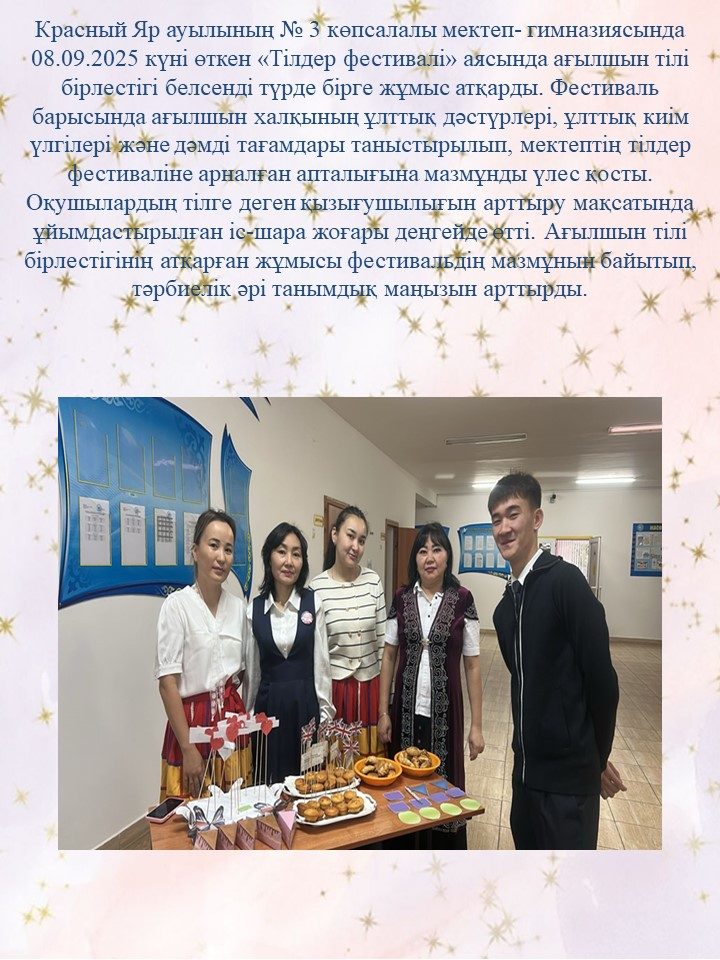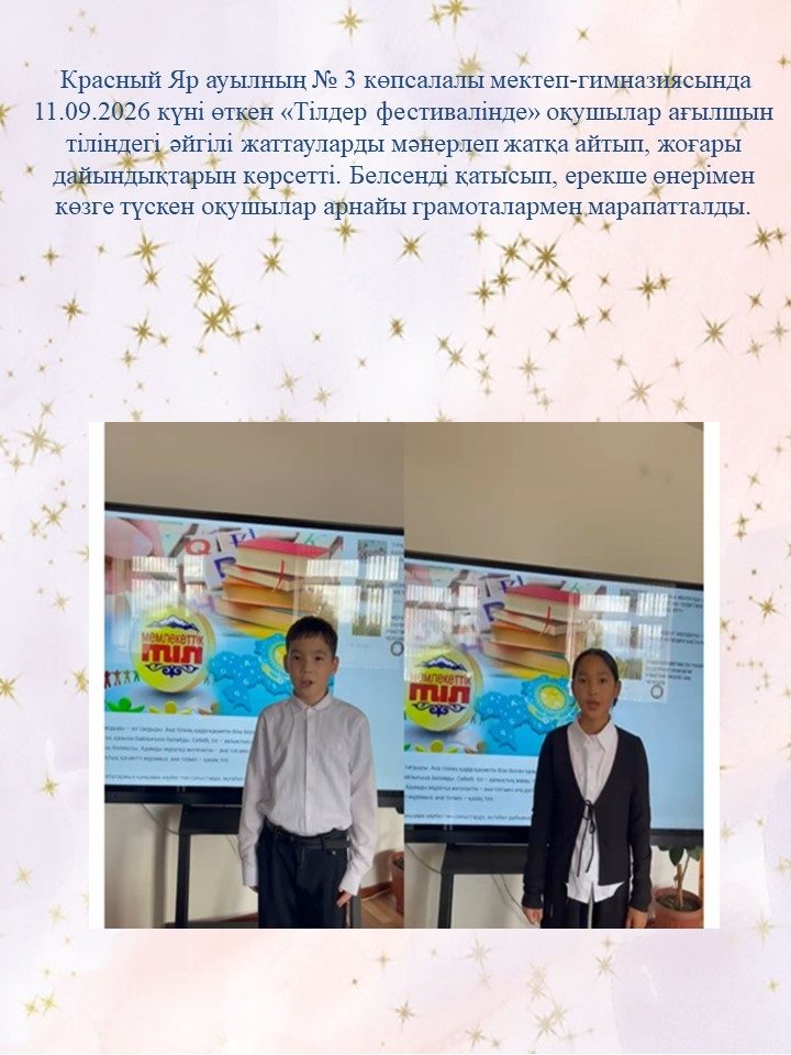 13 сентября на базе КГУ имени Ш. Уалиханова прошла полиязычная олимпиада среди учащихся 11 классов города, где принимала участие и наша выпускница Бекешева Айым. Олимпиада состояла из трех туров, презентация на казахском языке, диктант по русскому языку и тестирование по английскому. Победители награждены грамотами ректора университета и денежными сертификатами.Наша ученица тож удостоилась сертификата ректора М. К. Сырлыбаева