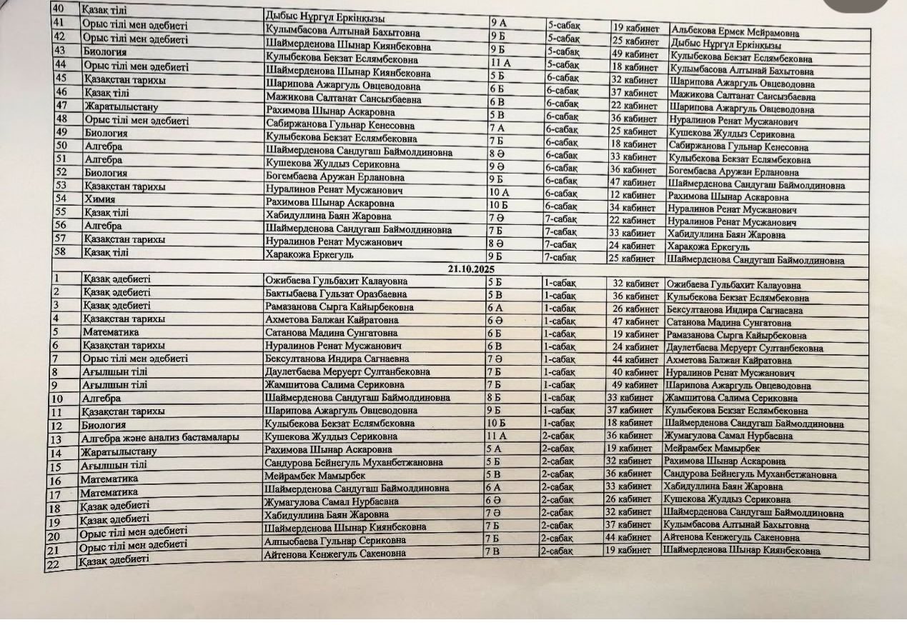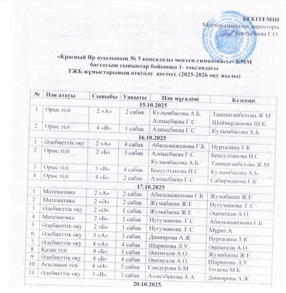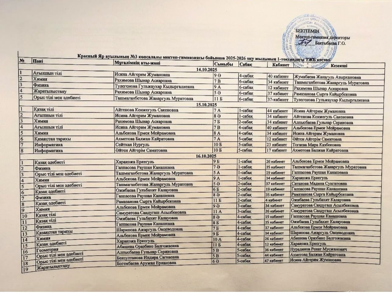 2025-2026 оқу жылының 1- тоқсандағы ТЖБ кестесі