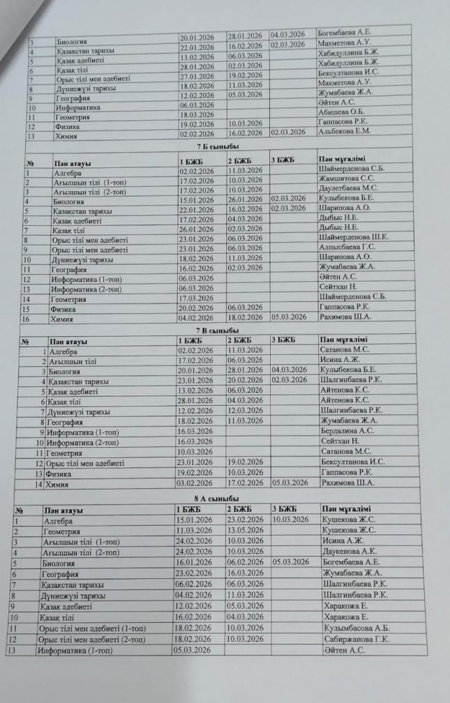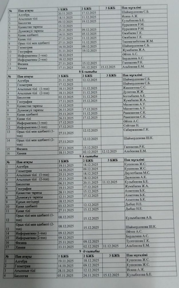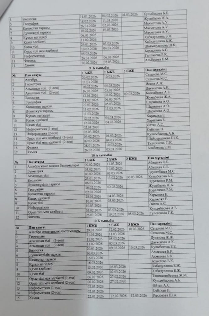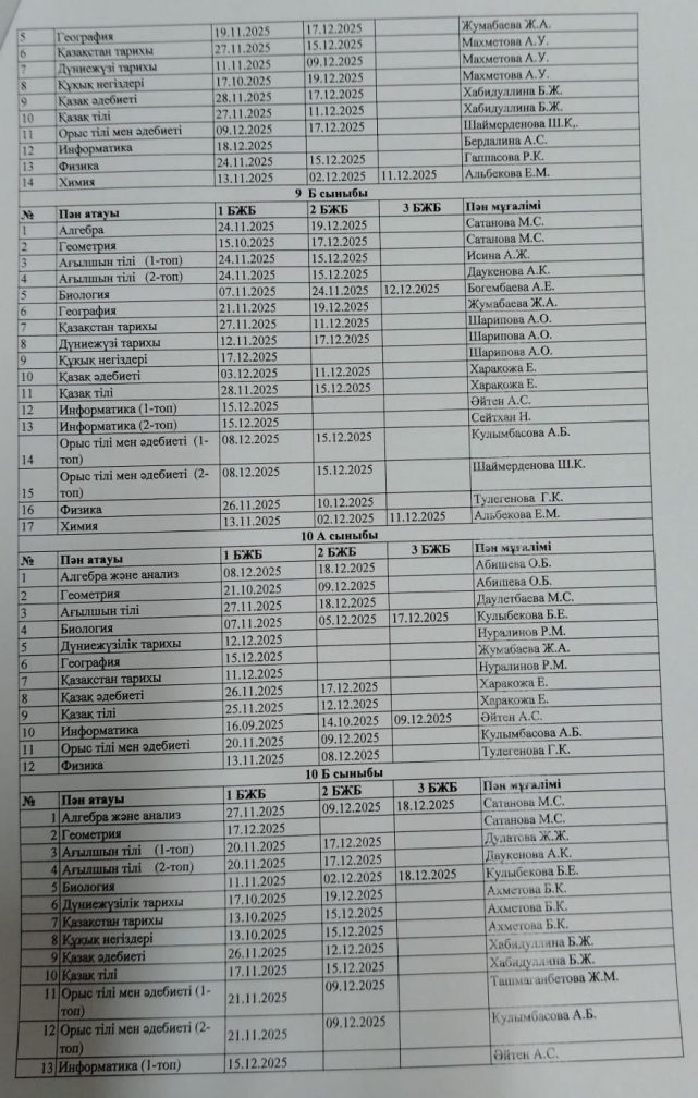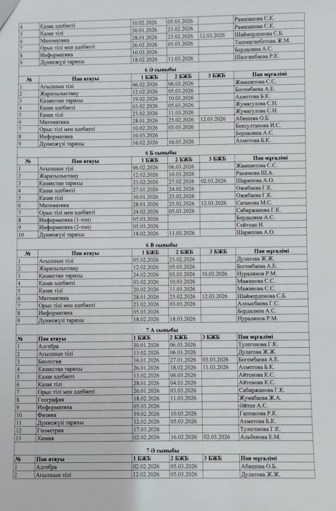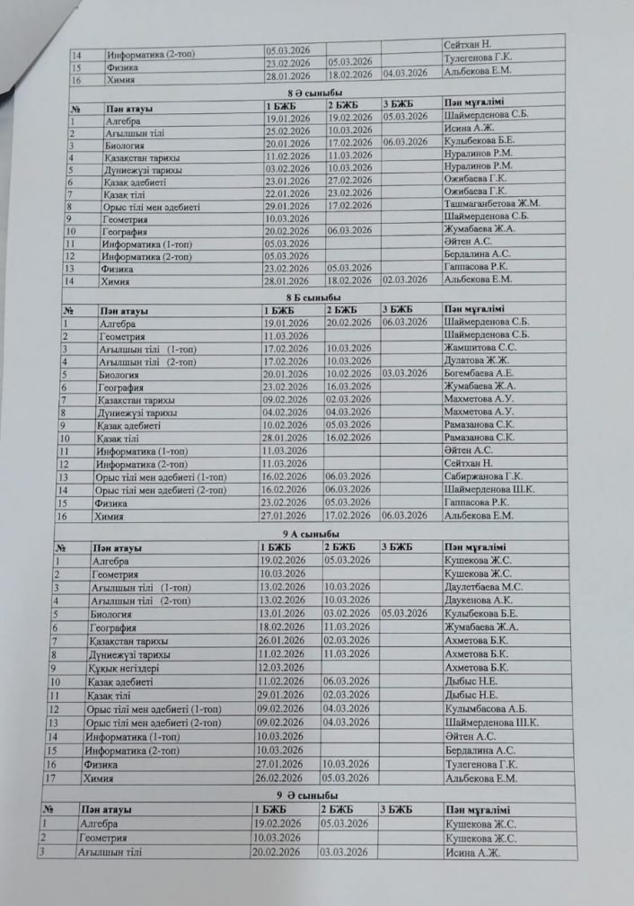 2025-2026 оқу жылының БЖБ өткізілу кестесі.