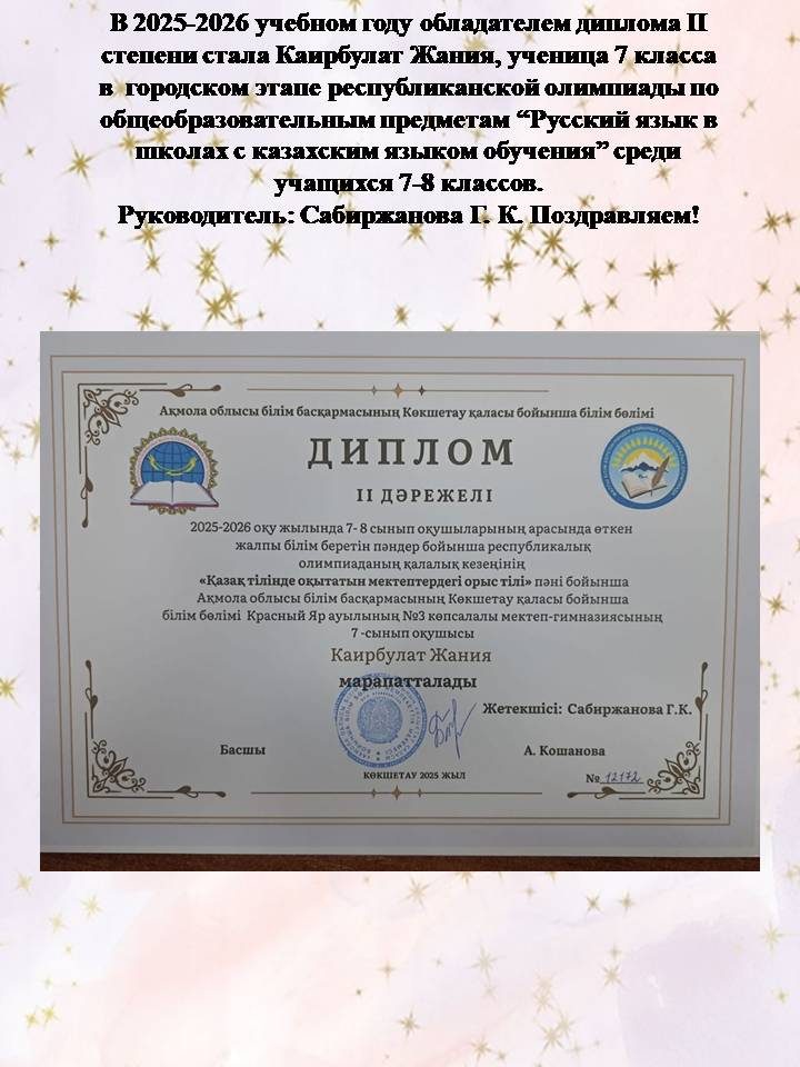 "Ақмола облысы білім басқармасының Көкшетау қаласы бойынша білім бөлімі Красный Яр ауылының №3 көпсалалы мектеп - гимназиясы" Коммуналдық Мемлекеттік мекемесі