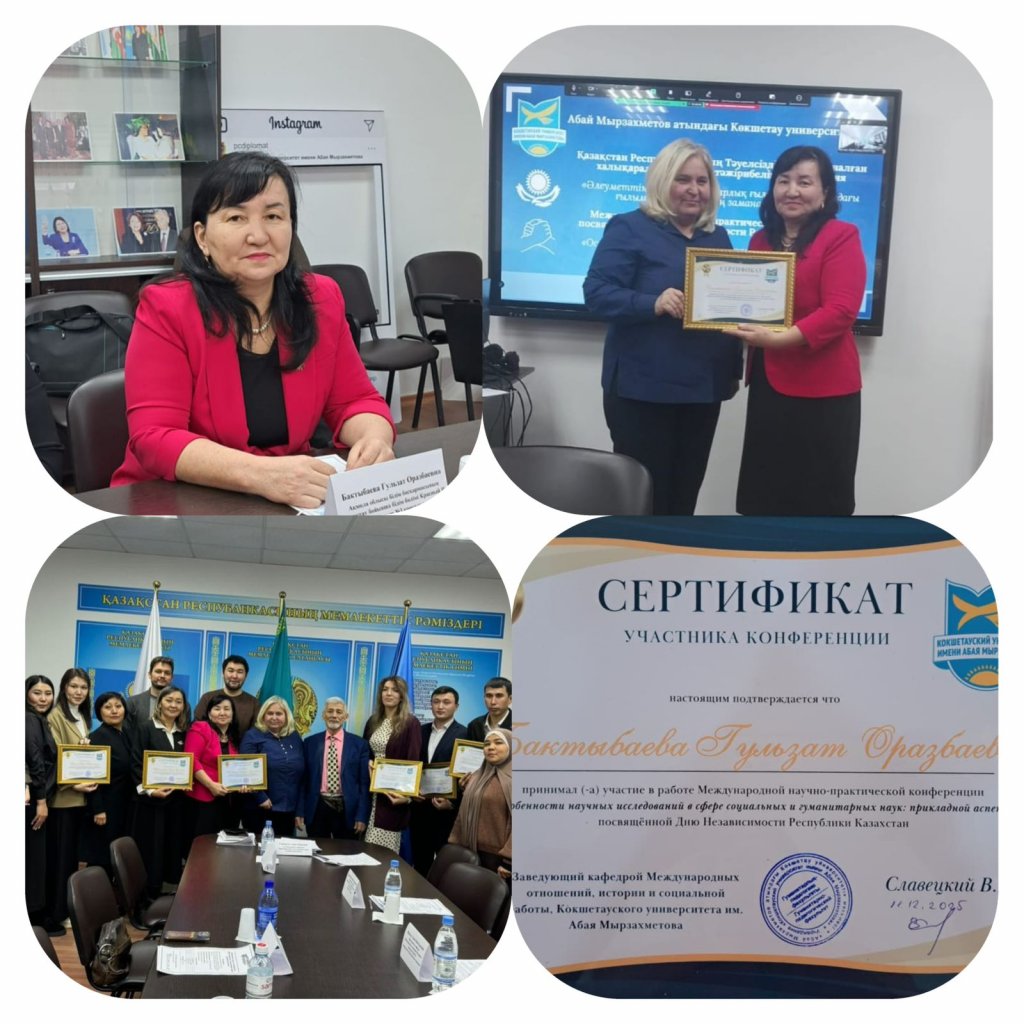А. Мырзахметов атындағы Көкшетау университеті Халықаралық қатынастар, тарих және әлеуметтік жұмыс кафедрасы ұйымдастырған "Әлеуметтік және гуманитарлық ғылымдар саласындағы ғылыми зерттеулердің ерекшеліктері: қолданбалы аспект" атты халықаралық ғылыми - тәжірибелік конференцияға мектеп - гимназия директоры, "басшы - ұйымдастырушы", қазақ тілі мен әдебиеті пәні мұғалімі, " педагог - зерттеуші" Гульзат Оразбаевна Бактыбаева қатысып, іс - тәжірибе таратты.