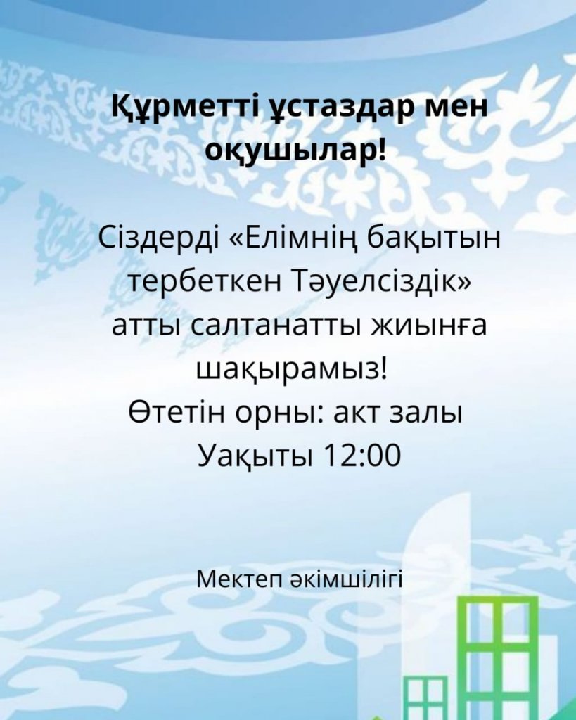 Құрметті ұстаздар мен оқушылар! Сіздерді "Елімнің бақытын тербеткен Тәуелсіздік " атты салтанатты жиынға шақырамыз! Өтетін орны: акт залы Уақыты 12:00 Мектеп әкімшілігі