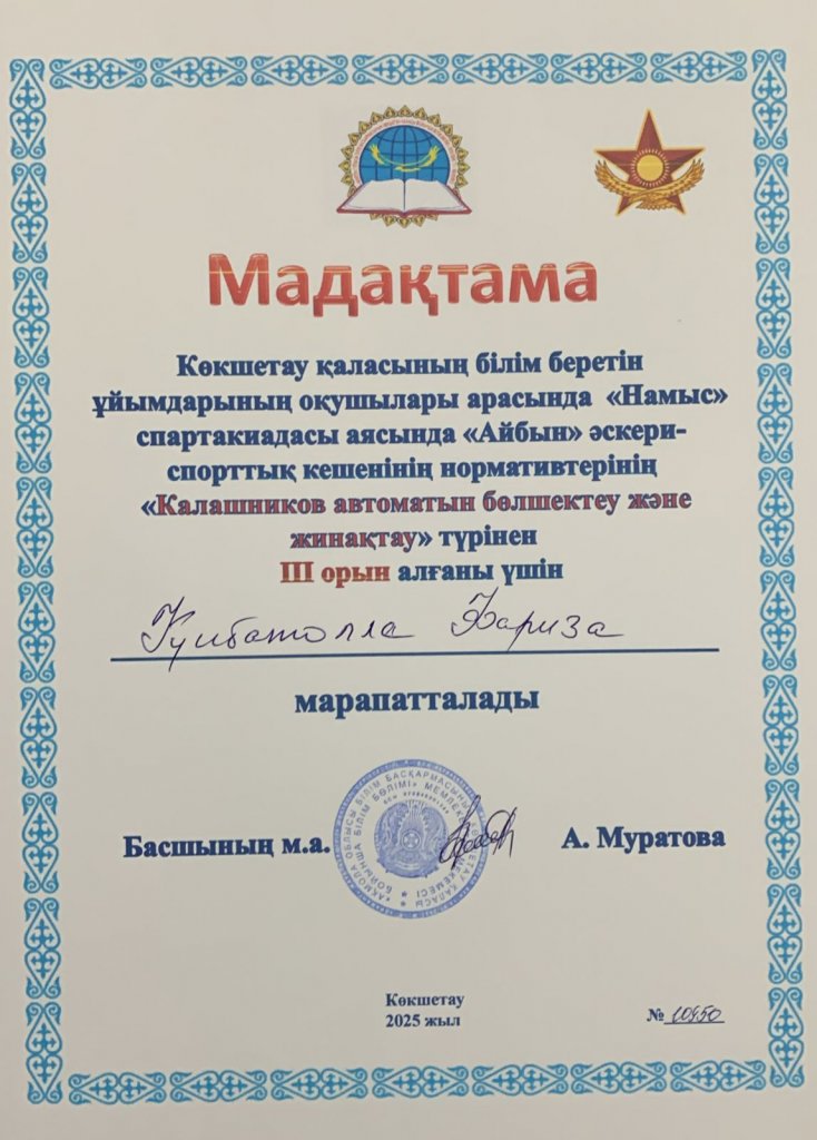 Көкшетау қаласының білім беретін ұйымдарының оқушылары арасында «Намыс» спартакиада аясында «Айбын» әскери-спорттық кешенінің нормативтерінің «Калашников автоматын бөлшектеу және жинақтау» түрінен 1орын алғаны үшін Төлеген Адина, 3 орын...