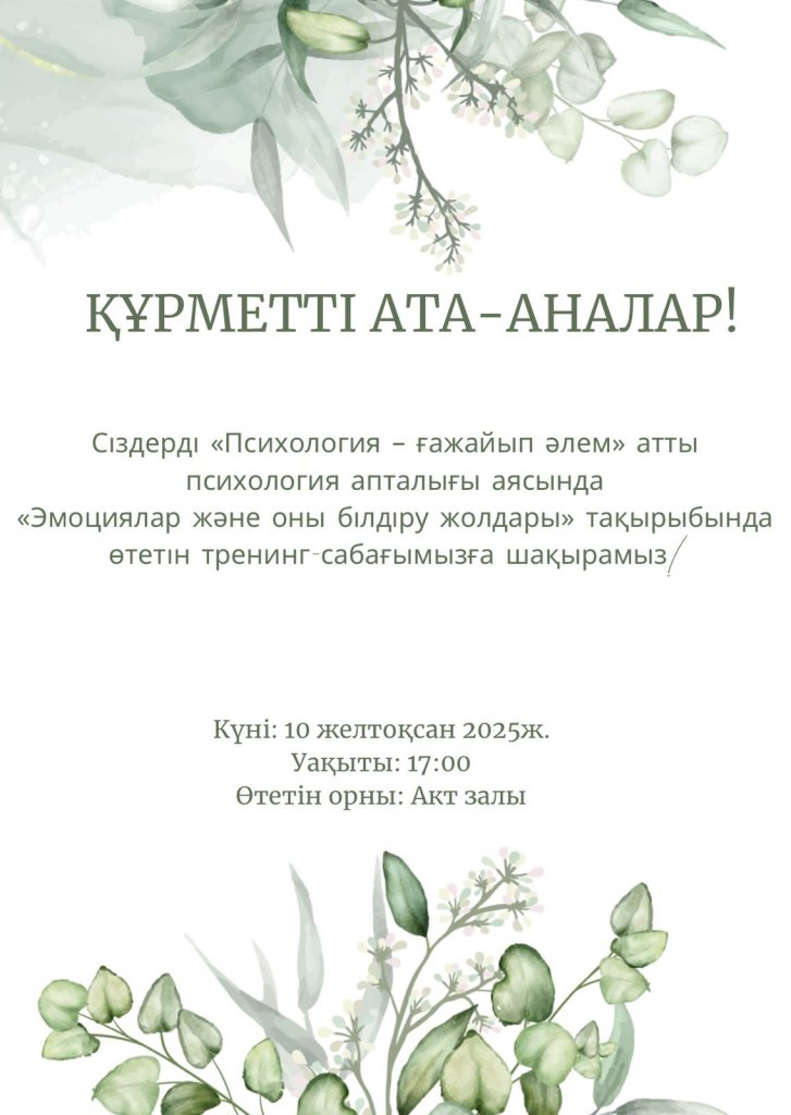 Құрметті ата-аналар! Сіздерді "Психология-ғажайып әлем" атты психология апталығы аясында "Эмоциялар және оны білдіру жолдары" тақырыбында өтетін тренинг-сабағымызға шақырамыз. Күні: 10 желтоқсан 2025ж. Уақыты: 17:00 Өтетін орны : Акт залы