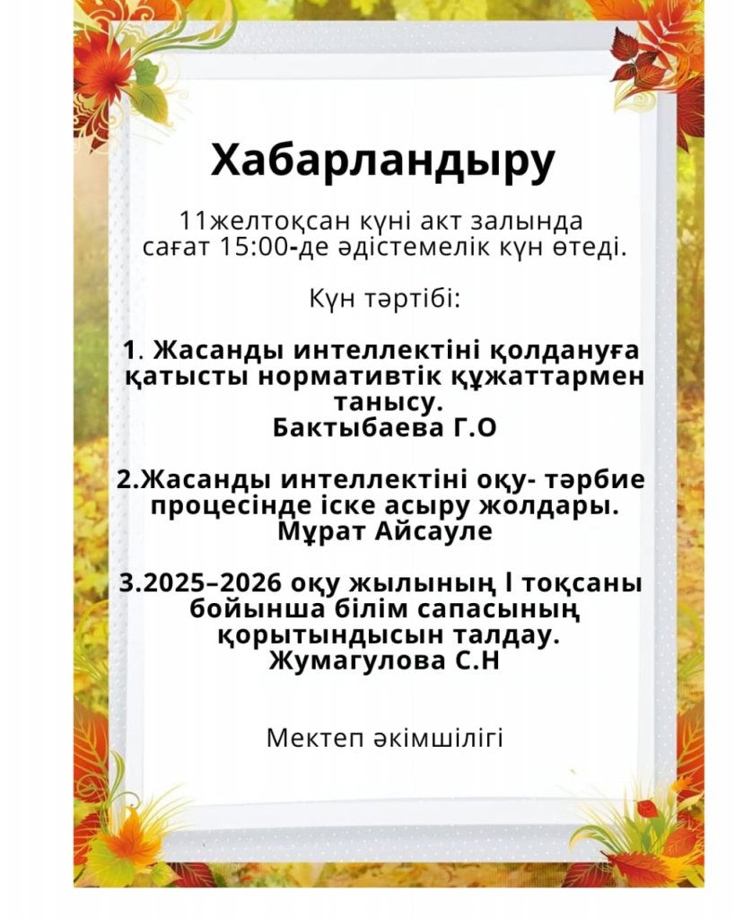 11 желтоқсан күні акт залында сағат 15:00-де әдістемелік күн өтеді. Күн тәртібі: 1 Жасанды интеллектіні қолдануға қатысты нормативтік құжаттармен танысу. Бактыбаева Г.О 2. Жасанды интеллектіні оқу-тәрбие процесінде іске асыру жолдары. Мұрат Айсауле 3.2025-2026 оқу...