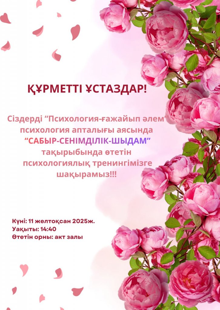 Құрметті ұстаздар! Сіздерді "Писихологиялық-ғажайып әлемі" психолгия апталығы аясында "Сабыр-Сенімділік-Шыдам " тақырыбында өтетін психологиялық тренингімізге шақырамыз! Күні:11 желтоқсан 2025ж. Уақыты: 14:40 Өтетін орны: акт залы