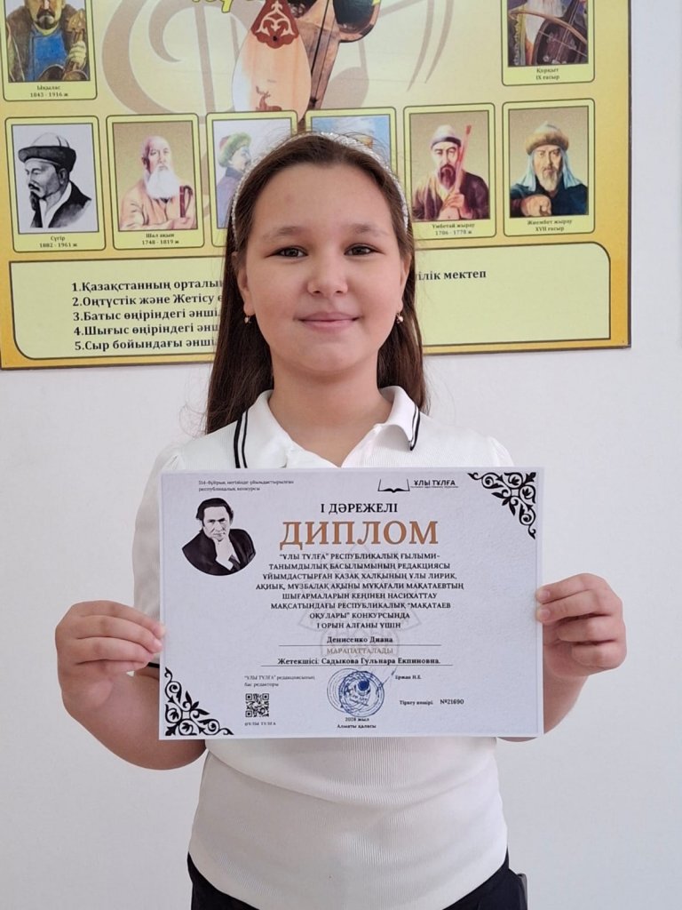 «ҰЛЫ ТҰЛҒА» республикалық «Мақатаев оқулары» байқауында «Вокал» номинациясы бойынша I дәрежелі дипломмен Денисенко Диана марапатталды.Жетекшісі – Садыкова Гульнара Екпиновна.