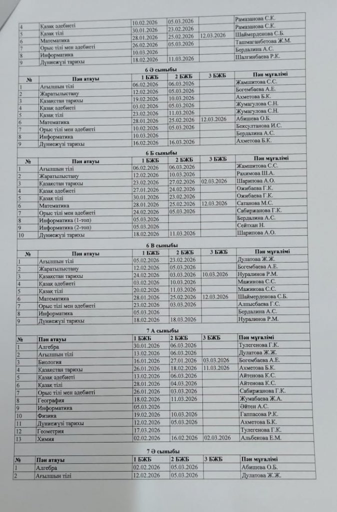 2025-2026 оқу жылының 3-тоқсанындағы БЖБ өткізілу кестесі.