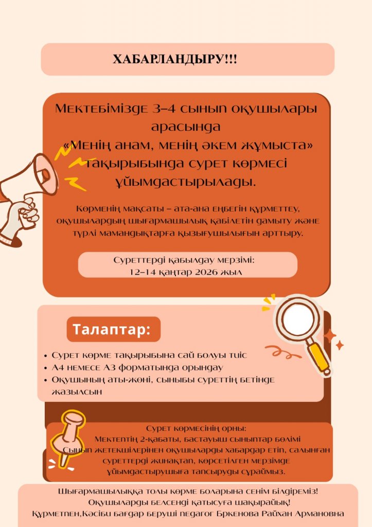 «Менің анам, менің әкем жұмыста» тақырыбында сурет көрмесі ұйымдастырылады.