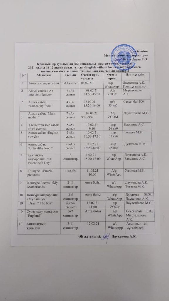 2021 жылы 5 тамызда ағылшын тілі мұғалімі Тогаева Мира Казбековна мектеп оқушыларымен «Ағылшын балаларының сүйікті ертегілері мен кейіпкерлері» тақырыбында сабақ өткізді.