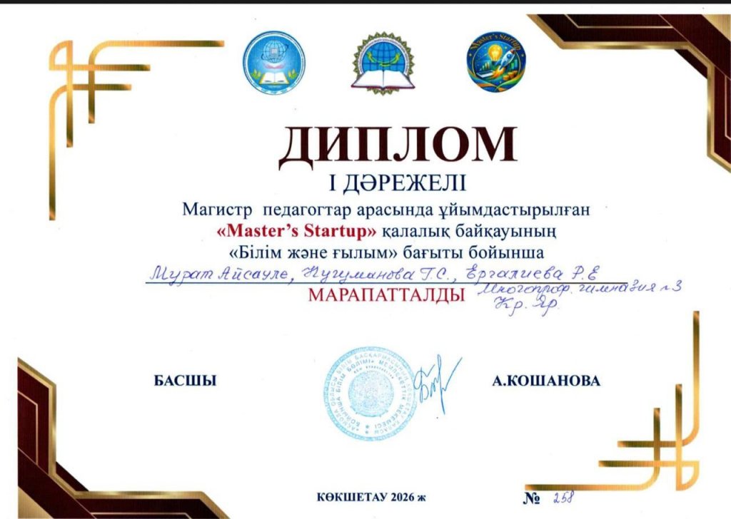 2026 жылдың 20 ақпаны күні М. Ғабдуллин атындағы N3 көпсалалы мектеп -гимназиясында өткен “MAGISTER’S STARTUP 2026.” қалалық байқауында Красный Яр ауылының N3 көпсалалы мектеп-гимназиясының бастауыш сынып мұғалімдері Мұрат А, Нугуманова Г.С, Ергалиева Р.Е “Білім және...