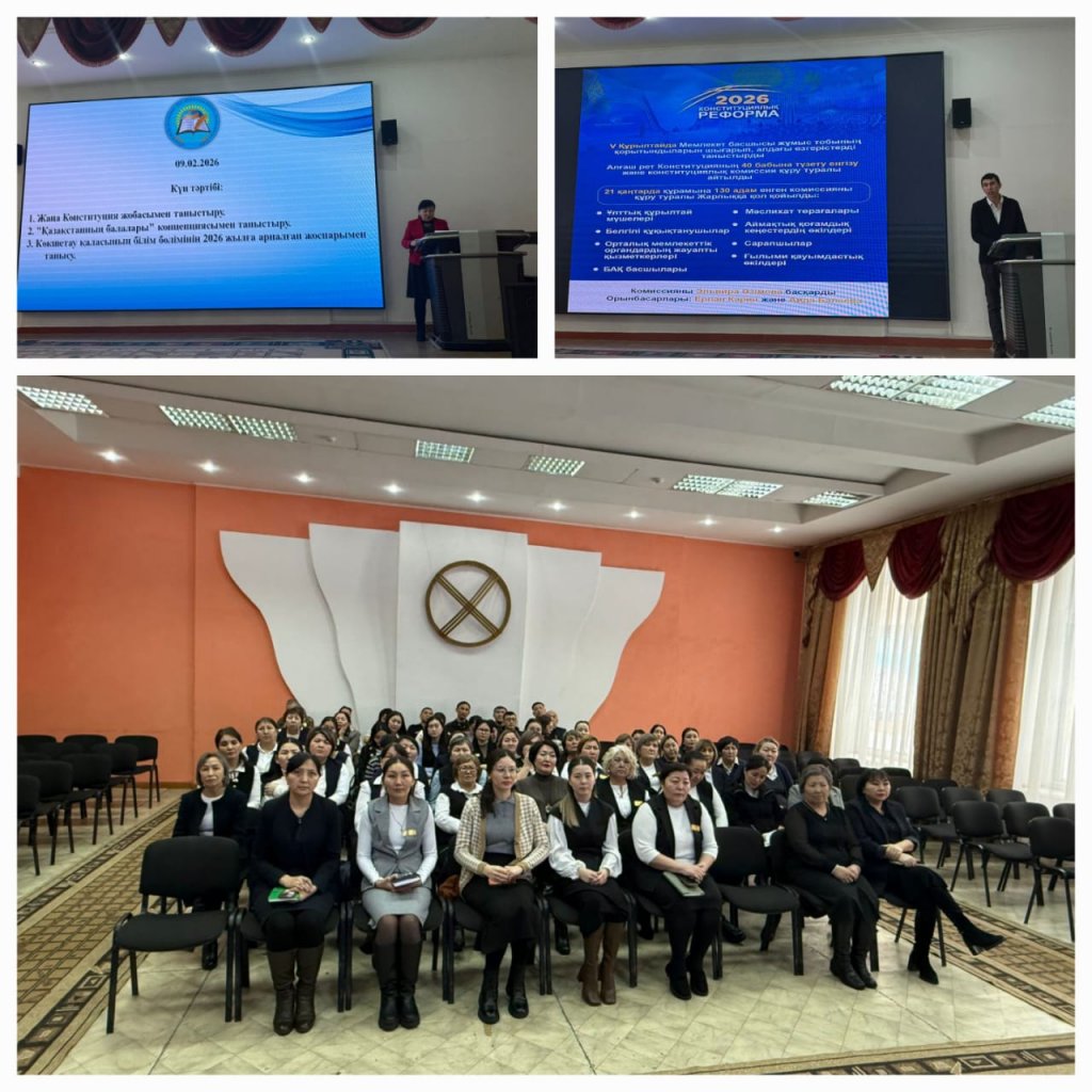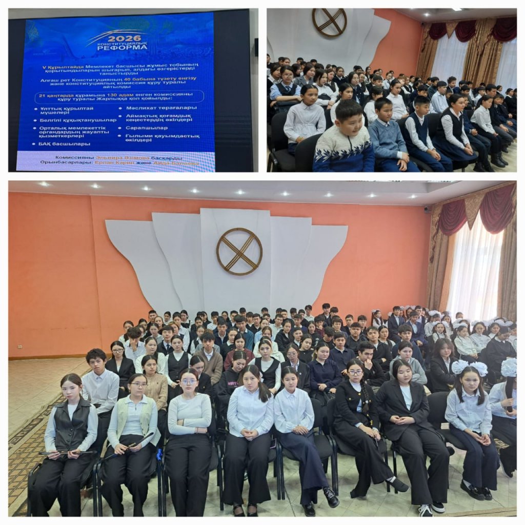 12.02.2026 жылы Қазақстан Республикасының Конституциясына енгізілген өзгерістерге байланысты мектеп оқушыларымен диалогтық алаң өткізілді. Іс-шара барысында Конституциялық реформалардың маңызы түсіндіріліп, қатысушылар арасында ашық пікір алмасу ұйымдастырылды.