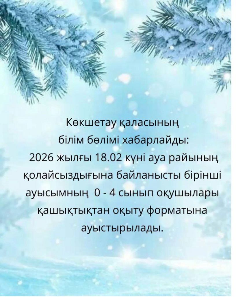Көкшетау қаласының білім бөлімі хабарлайды: 2026 жылғы 18.02 күні ауа райының қолайсыздығына байланысты бірінші ауысымның 0 - 4 сынып оқушылары қашықтан оқыту форматына ауыстырылады.