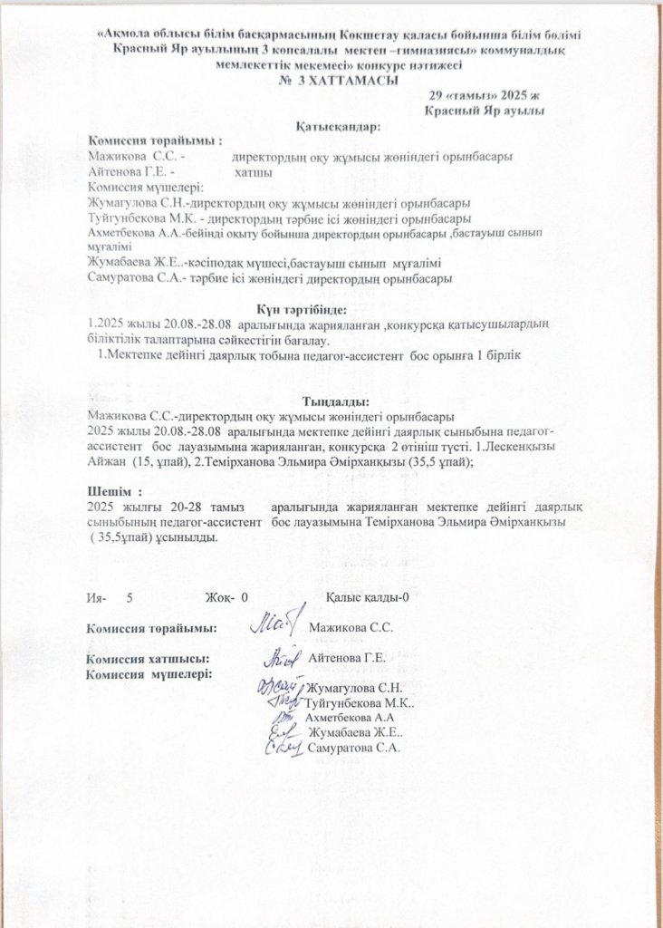 "Ақмола облысы білім басқармасының Көкшетау қаласы бойынша білім бөлімі Красный Яр ауылының 3 көпсалалы мектеп-гимназиясы"коммуналдық мемлекеттік мекемесі" конкурс нәтижесі