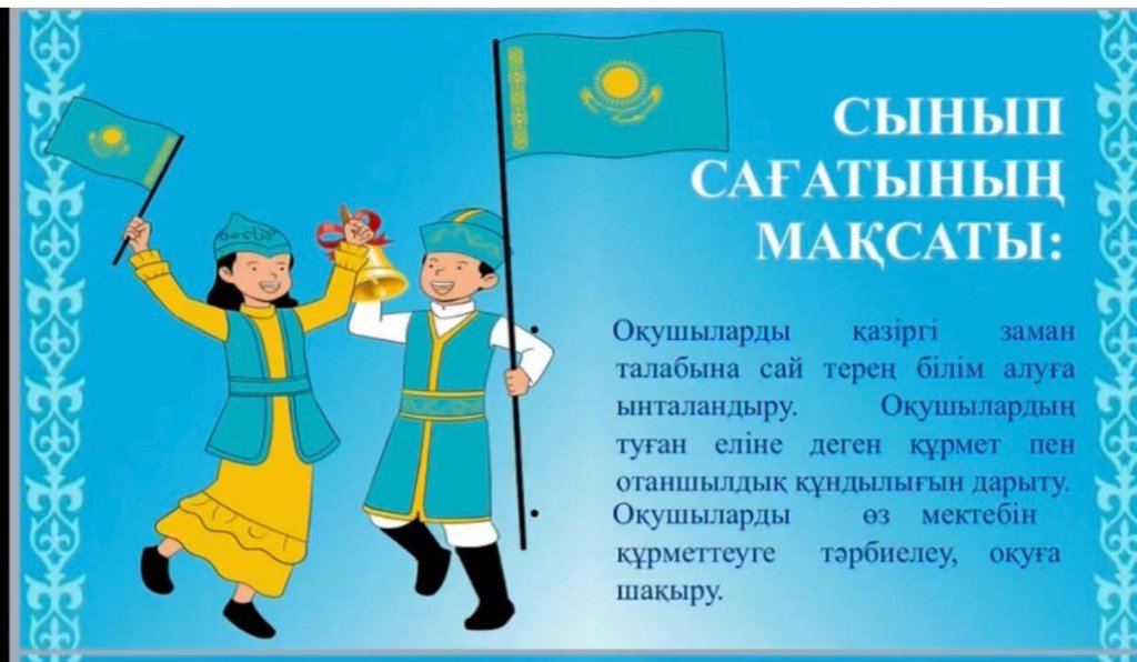 9 "Б" сыныпта "Менің Отаным - Қазақстан " тақырыбында сынып сағаты өткізілді. Мақсаты:Адал азамат» тұжырымдамасының идеалдарына сай, патриоттық рухта тәрбиеленген, білімді әрі жасампаз ұрпақты қалыптастыру. Жаңа оқу жылында негізгі 6 құндылық бойынша тәрбие бағытындағы жұмыстар , қазіргі заман
