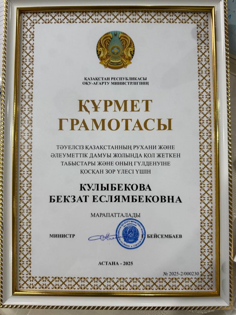 Қазақстан Республикасы оқу -ағарту министрлігінің алғыс хатымен білім берудегі Тәуелсіз Қазақстанның рухани және әлуметтік дамуы жолында қол жеткен табыстары және оның гүлденуіне қосқан зор үлесі үшін Красный Яр ауылының №3 көпсалалы мектеп-гимназиясының биология пәнінің мұғалімі Кулыбекова Бекзат Еслямбековна марапатталды. Құттықтаймыз!