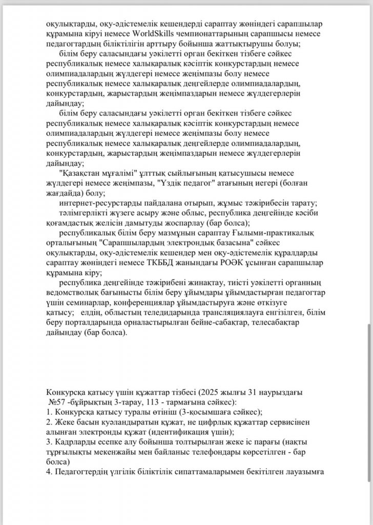 "Қазақстан мұғалімі" ұлттық сыйлығының қатысушысы немесе жүлдегері немесе жеңімпазы, "Үздік педагог" атағының иегері (болған жағдайда) болу;