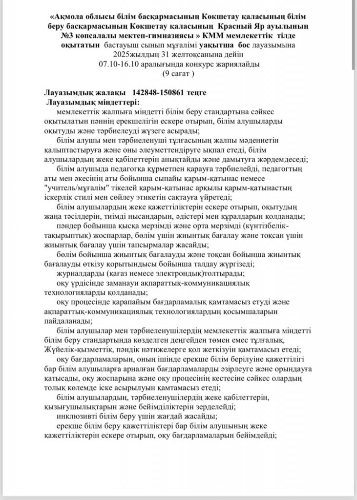«Ақмола облысы білім басқармасының Көкшетау қаласының білім беру басқармасының Көкшетау қаласының Красный Яр ауылының №3 көпсалалы мектеп-гимназиясы » КММ мемлекеттік тілде оқытатын бастауыш сынып мұғалімі уақытша бос лауазымына 2025жылдың 31 желтоқсанына дейін