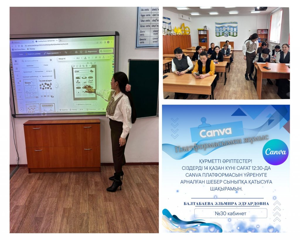 14 қаңтар күні сағат 12:30-да Canva платформасымен жұмыс істеуге арналған шеберлік сыныбы өтті. Бұл шараға мұғалімдер қатысып, платформамен жұмыс істеу тәсілдерін үйренді.