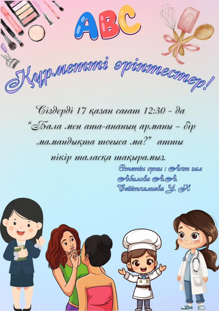 Құрметті әріптестер! Сіздерді 17 қазанда сағат 12.30-да "Бала мен ата-ананың арманы – бір мамандықта тоғыса ма?" атты пікірталасқа шақырамыз.