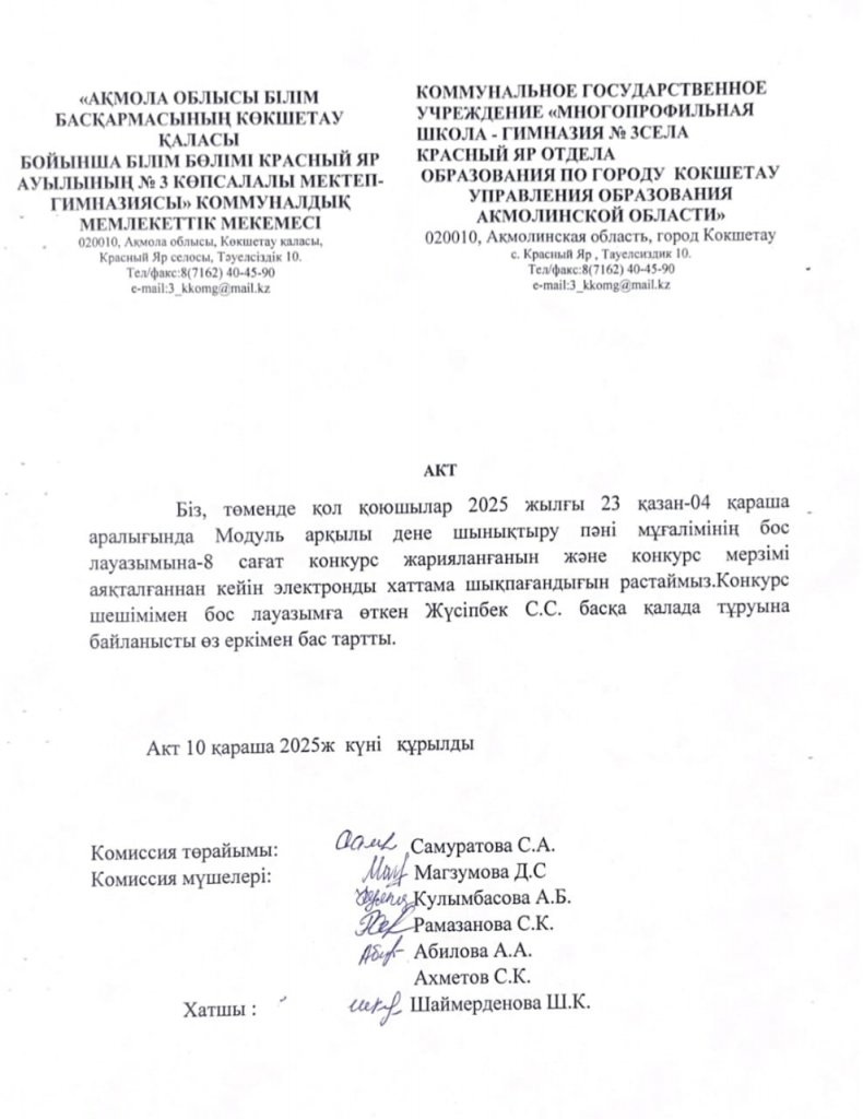 "Ақмола облысы білім басқармасының Көкшетау қаласы бойынша білім бөлімі Красный Яр ауылының №3 көпсалалы мектеп-гимназиясы " коммуналдық мемлекеттік мекемесі конкурс нәтижесі .