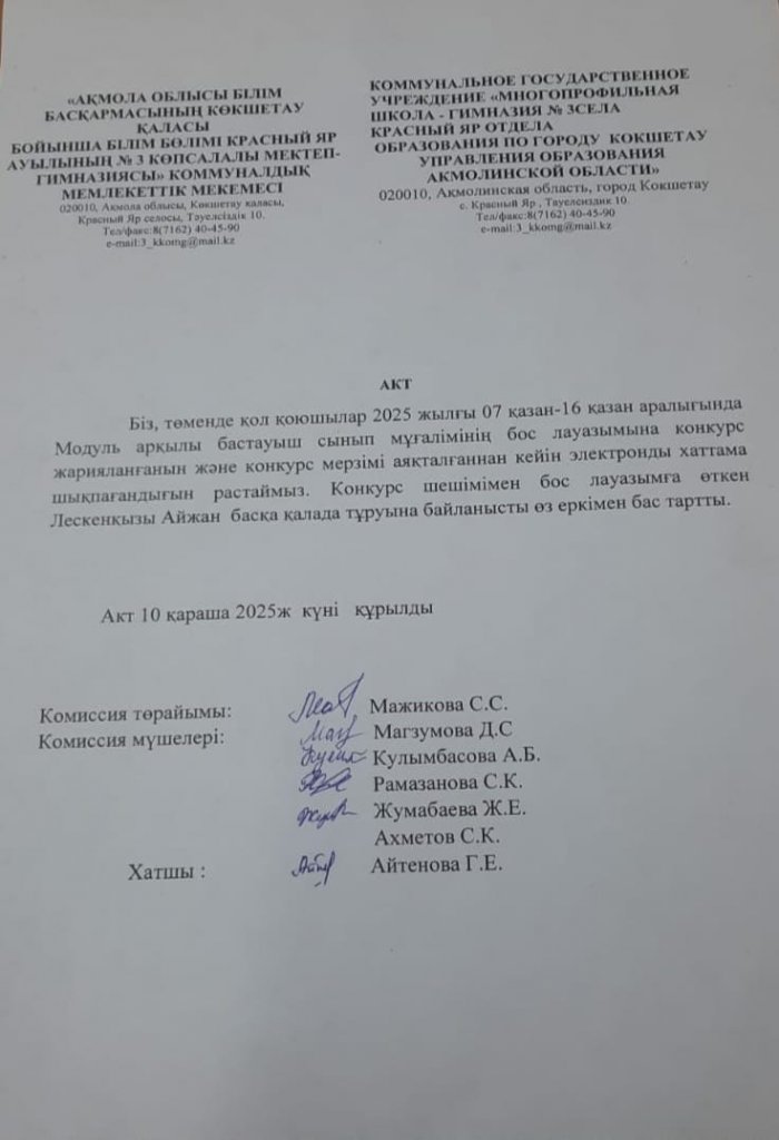 "Ақмола облысы білім басқармасының Көкшетау қаласы бойынша білім бөлімі Красный Яр ауылының №3 көпсалалы мектеп-гимназиясы " коммуналдық мемлекеттік мекемесі конкурс нәтижесі .