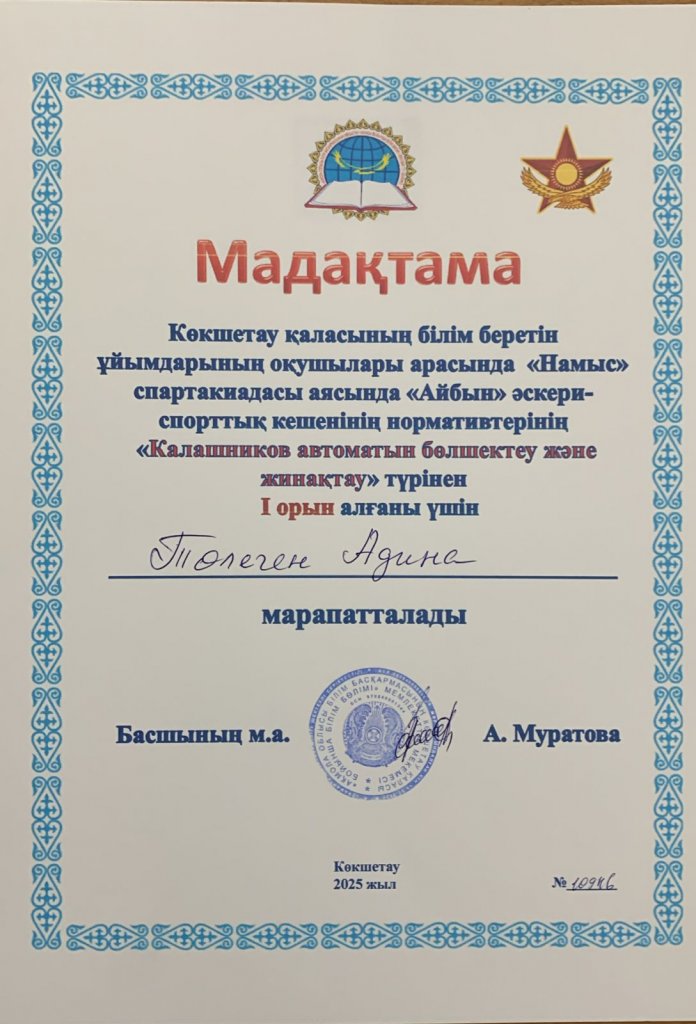 Көкшетау қаласының білім беретін ұйымдарының оқушылары арасында «Намыс» спартакиада аясында «Айбын» әскери-спорттық кешенінің нормативтерінің «Калашников автоматын бөлшектеу және жинақтау» түрінен 1орын алғаны үшін Төлеген Адина, 3 орын алғаны үшін Қибатолла Фариза марапатталды.