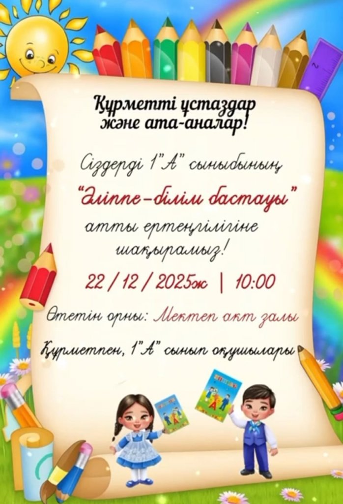 Құрметті ұстаздар және ата-аналар ! Сіздерді 1"А" сыныбының "Әліппе-білім бастауы" атты ертеңгілігіне шақырамыз! 22/12/2025ж/10:00 Өтетін орны: Мектеп акт залы. Құрметпен, 1 "А" сынып оқушылары