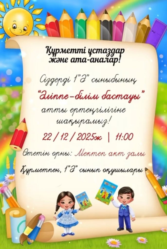 Құрметті ұстаздар және ата-аналар ! Сіздерді 1"Ә" сыныбының "Әліппе-білім бастауы" атты ертеңгілігіне шақырамыз! 22/12/2025ж/11:00 Өтетін орны: Мектеп акт залы. Құрметпен, 1 "А" сынып оқушылары