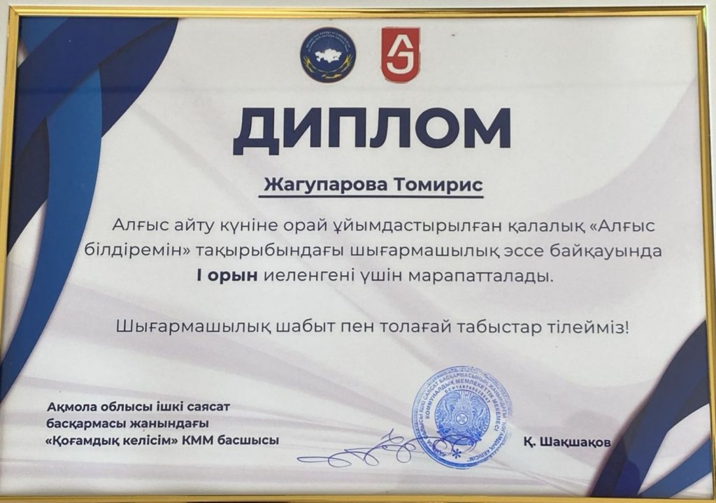 Ақмола облысы ішкі саясат басқармасының жанындағы «Қоғамдық келісім» КММ Алғыс айту күніне орай жастар арасында ұйымдастырылған шығармашылық эссе байқауынан