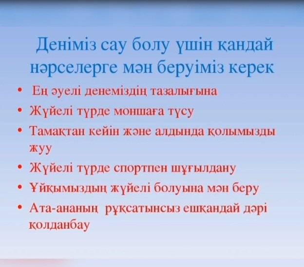 № 3 Красный Яр көпсалалы орта мектеп - гимназиясының 6 "В" сынып жетекшісі Сатанова Мадина Сунгатовна оқушыларымен "Денің сау болсын десең!" тақырыбында танымдық тәрбие сағатын өткізді. Тәрбие сағаты барысында әр адам өз денсаулығын қалай күту, салауатты өмір салтын ұстану, денсаулықты бағалай білу туралы айтылды.