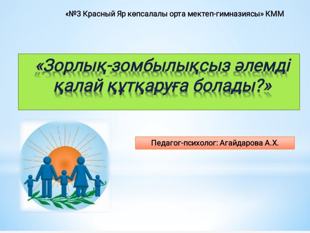 # 3 Красный Яр көпсалалы орта мектеп - гимназиясының педагог - психологы А.Х. Агайдарова 9-11 сынып оқушыларына "Зорлық - зомбылықсыз әлемді қалай құтқаруға болады?" тақырыбында қашықтықтан ақпарат беріп, эссе жазғызды. Мақсаты: оқушыларға зорлық - зомбылық туралы мағлұмат беру, адамның жаны мен тәніне үлкен зардап әкелетін соққы екенін түсіндіру.
